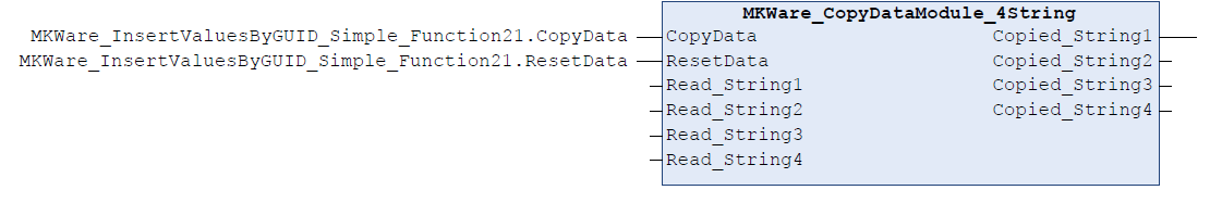 Dieser Funktionsbaustein kann 4 String Werte kopieren. Das Kopier-/Reset-Signal sollte von den PDA-FBs „normal“ oder „einfach“ kommen.