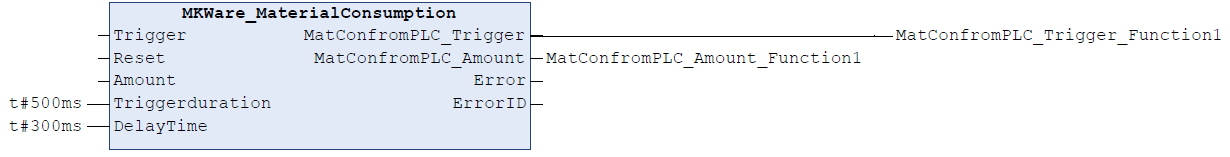 VAR_OUTPUT MatConfromPLC_Trigger: BOOL; (* Ausgabe an MK|Ware: OK oder NOK Trigger-Signal für ein Produkt, welches den Arbeitsplatz am Austrittspunkt verlässt *) MatConfromPLC_Amount: INT; (* Ausgabe an MK|Ware: Menge des verbrauchten Materials *) Error: STRING; (* Fehlerbeschreibung zur Fehleranalyse *) ErrorID: INT; (* Fehler ID zur Fehleranalyse *) END_VAR