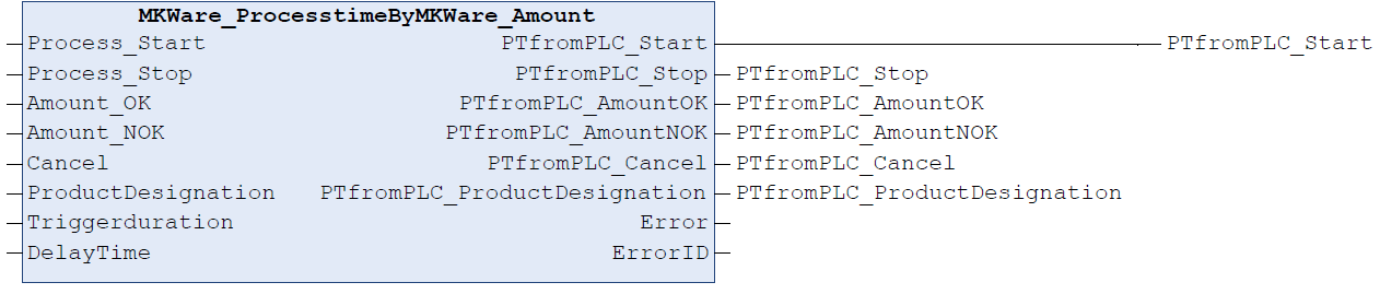 Dieser Funktionsbaustein sendet Start- und Stoppsignale eines Prozesses an MK|Ware. Dort wird die zeitliche Differenz der Signale gemessen, um die Prozesszeit zu generieren. Zusätzlich werden die Anzahl von OK- und NOK-Produkten übermittelt. Gibt die Steuerung die beiden Start- und Stopp-Signale nicht her, kann auch nur die Dauer des anliegenden Startsignals verwendet werden. Wie die Prozesszeit generiert wird, legt die Konfiguration im MKSupervisor fest.