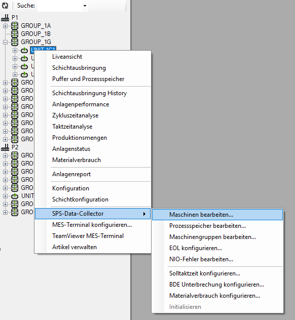 Klicken Sie mit der rechten Maustaste auf die Anlage die bearbeitet werden soll und wählen Sie das unter dem Punkt SPS-Data-Collector das Menü Maschinen bearbeiten.