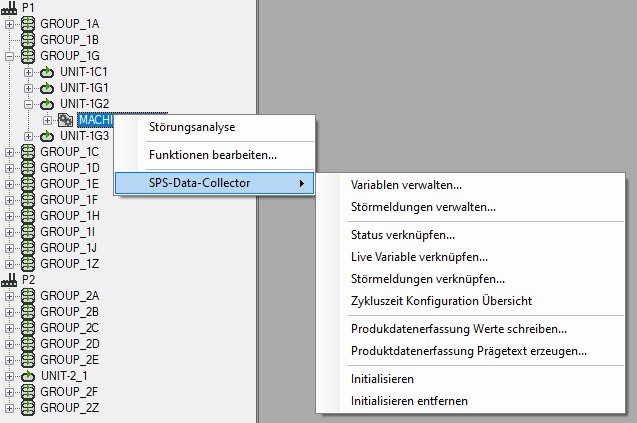 Die Menüs zur Konfiguration oder zum Monitoring einer Maschine werden durch Klicken mit der rechten Maustaste auf die betreffende Maschine verfügbar: