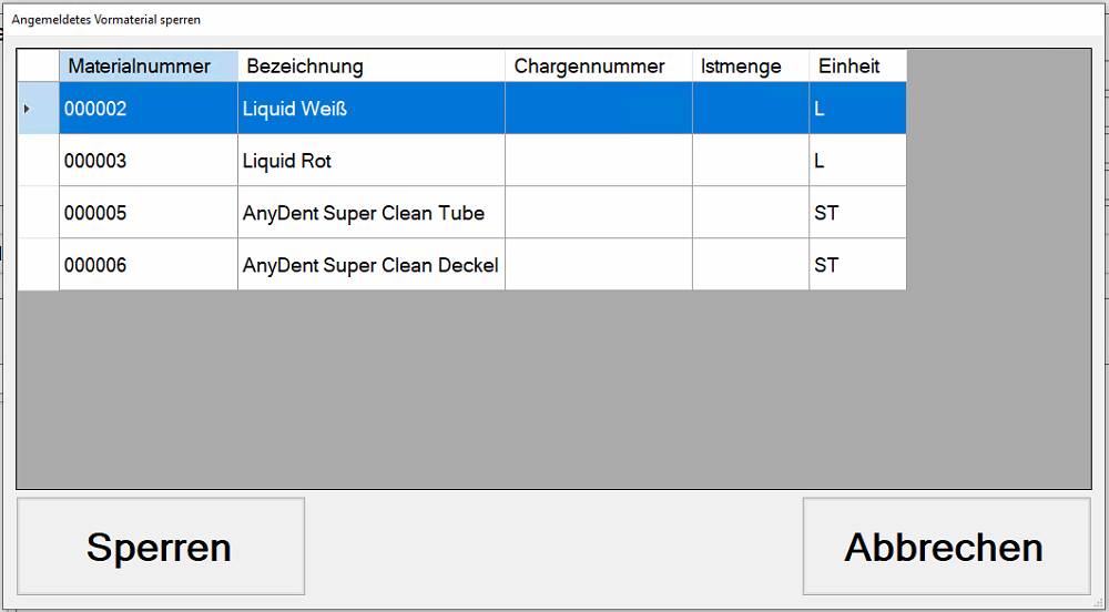 Sollte z.B. festgestellt werden, dass das sich an dem Arbeitsplatz befindliche Vormaterial schadhaft ist, so kann dieses über dieses Menü für die weitere Verwendung gesperrt werden. Über die Schaltfläche sperren wird das in der Liste markierte Material gesperrt.
