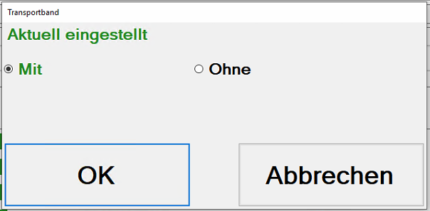 Die Option Mit (Transportband) beschreibt die normale Situation, also dass von dem Arbeitsplatz identifizierte NOK-Produkte automatisch in den NOK-Behälter 1 aussortiert werden. Die Option Ohne (Transportband) dient zur Korrekten Erfassung der NOK-Komponenten wenn ein Produkt manuell entnommen werden muss. In diesem Fall werden erst wieder Komponenten von OK zu NOK umgeschrieben wenn der Werker die von dem Arbeitsplatz als NOK erkannte Anzahl an Produkten durch die Lichtschranke in den NOK-Behälter 2 aussortiert hat.