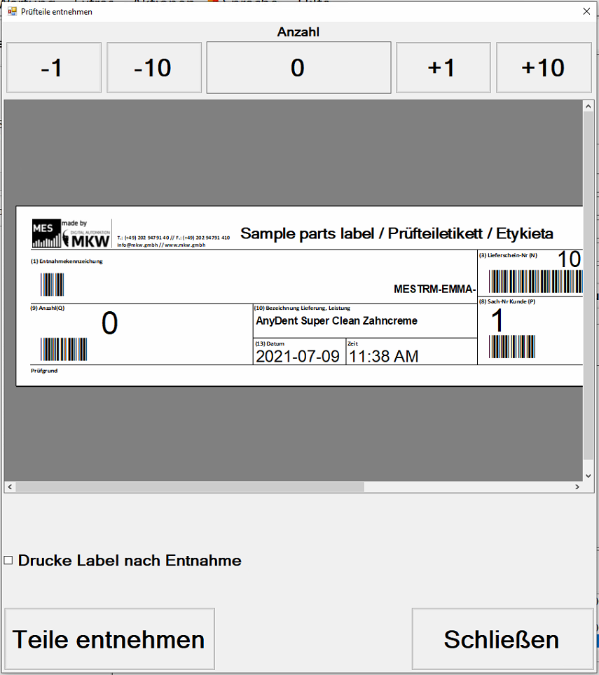 Über das Menü Prüfteile entnehmen kann die Entnahme von Teilen zu Testzwecken (z.B. QM) gebucht werden. Durch die -X/+X-Tasten kann die Anzahl der entnommenen Komponenten definiert werden. Über die Funktion Teile entnehmen wird die bestimmte Anzahl von der Summe der Fertigteile abgezogen. Wenn zuvor die Option Drucke Label nach Entnahme angewählt wurde, wird mit dem Buchen der Entnahme automatisch das in der Vorschau angezeigte Label zur Beschriftung der Prüfteil-HU gedruckt.