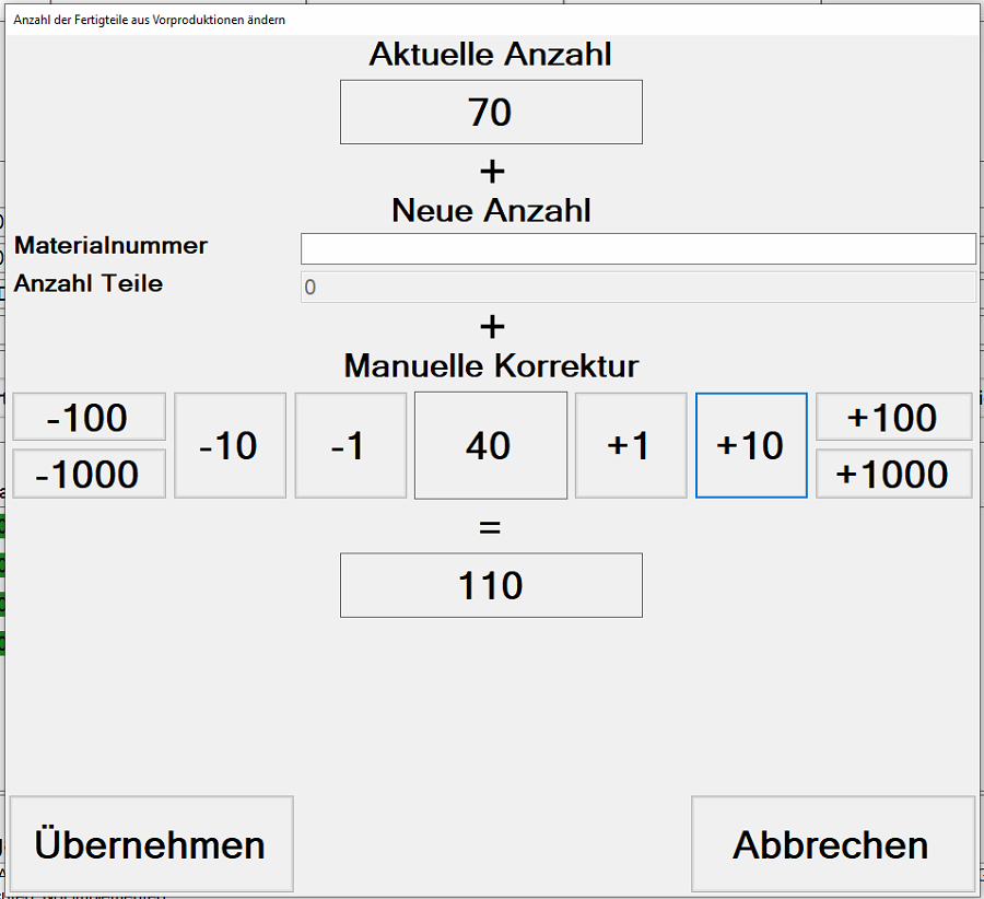 Über dieses Menü können zusätzliche Fertigteile auf den aktuellen Auftrag gebucht werden. Unter Aktuelle Anzahl werden die Zahl der für diesen Auftrag bisher produzierten Fertigteile angezeigt. Die Zahl der hinzuzufügenden Teile (Manuelle Korrektur) kann über die +X/-X-Tasten eingestellt werden. Übernehmen setzt die Anzahl der Fertigteile auf die neu berechnete Anzahl.