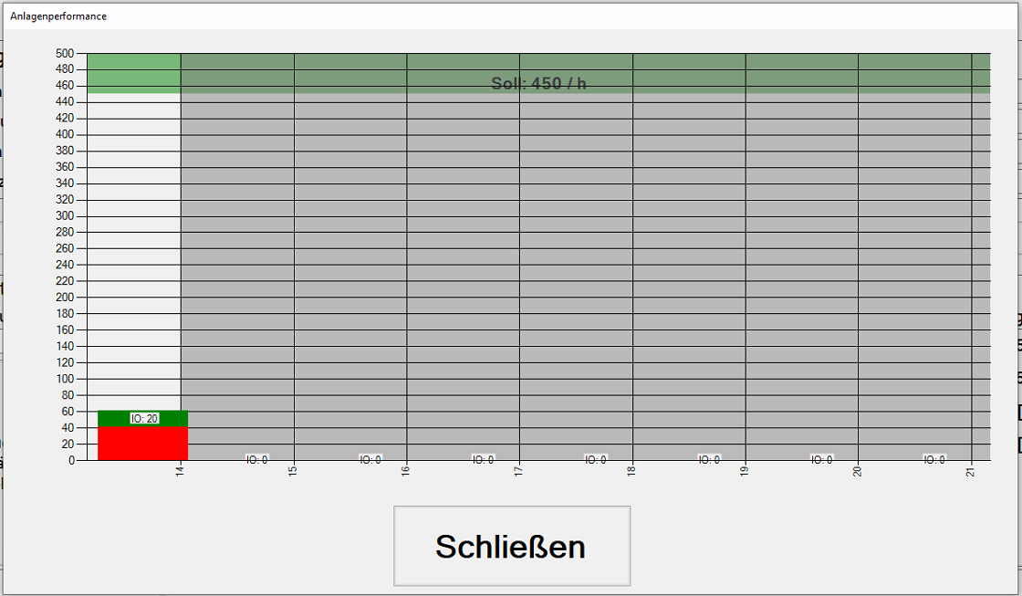 - Anlagenperformance: Auf der x-Achse ist die Zeit dargestellt, auf der y-Achse die Fertigteile pro Stunde. Der grüne Querbalken markiert die theoretische (Soll-) Leistung (Teile/h) der Anlage. Es werden für jede Stunde die produzierten IO- und NIO-Teile als Säulendiagramm dargestellt. Durch Anklicken des Diagramms kann dieses vergrößert dargestellt werden.