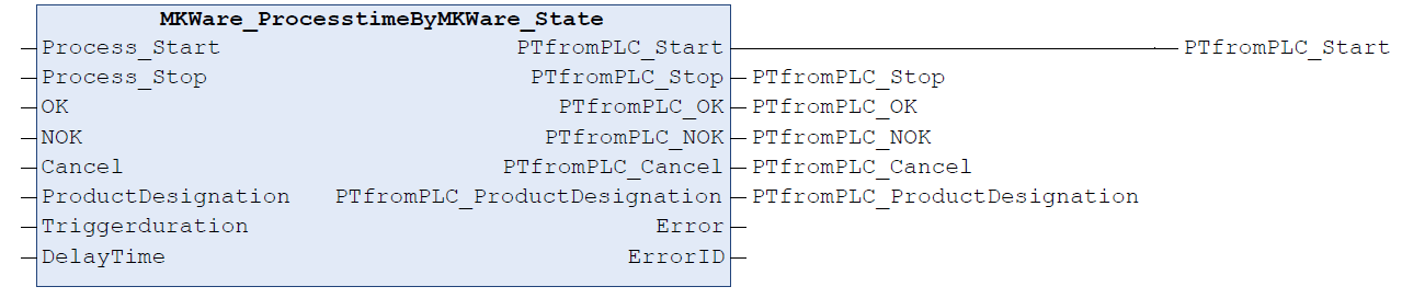 This function block sends start and stop signals of a process to MK|Ware. The time difference between the signals is measured there to generate the process time. It also sends the status of the process (OK / NOK), because NOK processes in MK|Ware are not included in the evaluation. If the PLC does not provide the two start and stop signals, only the duration of the active start signal can be used. The configuration in the MKSupervisor determines how the process time is generated.