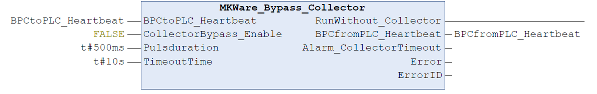 VAR_INPUT BPCtoPLC_Heartbeat: BOOL; (* Output from MK|Ware: heartbeat signal from MKTerminal *) CollectorBypass_Enable: BOOL; (* Signal to release production without MKCollector *) Pulsduration: TIME:= t#500ms; (* Duration of heartbeat pulse *) TimeoutTime: TIME:=t#10s; (* Timeout duration *) END_VAR