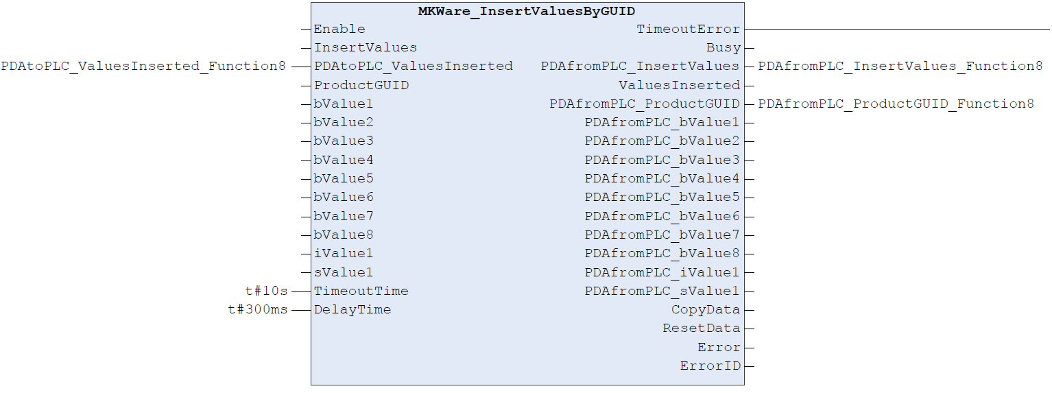 The function block transmits a GUID of the current product and the corresponding measured values to MK|Ware, which are to be stored in the database.