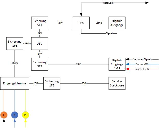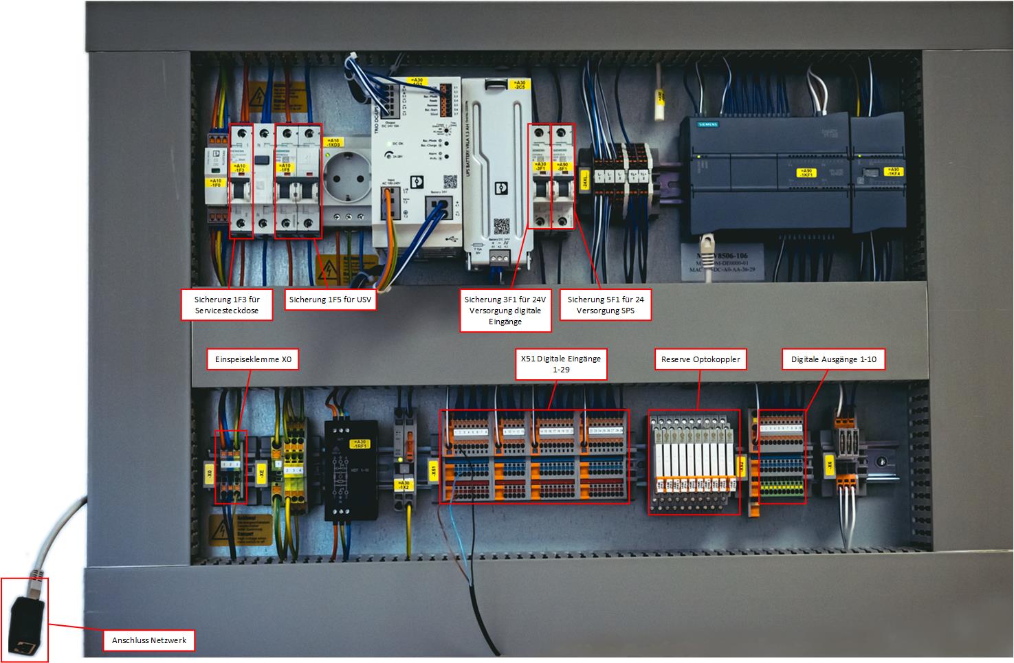 The MES-Combox is supplied with a German safety plug. This is for test purposes only and must be removed again for commissioning. The MES-Combox is operated with a hard-wired power supply and a back-up fuse (16A/type B). This is connected to terminal block X0. The phase of the power supply (usually the black cable) is connected to terminal 1 (in the figure the terminal with the orange outgoing cable). The neutral conductor (usually blue) is connected to the second terminal (blue outgoing cable) and the protective earth conductor (PE conductor, usually green-yellow) is connected to terminal 3 (green-yellow outgoing cable).