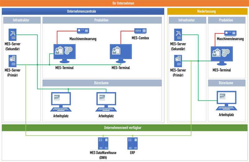 The MKW MES-Suite is a Manufacturing Execution System (MES) software for the organization and analysis of industrial production. The software includes machine, production and product data acquisition (MDE, BDE and PDE), production planning and control, personnel administration, warehouse management and cloud-based storage of worldwide, condensed production data. This allows the company management relevant insights into the state of their production. Accordingly, the system is characterized by a comprehensive vertical integration of different company levels.
